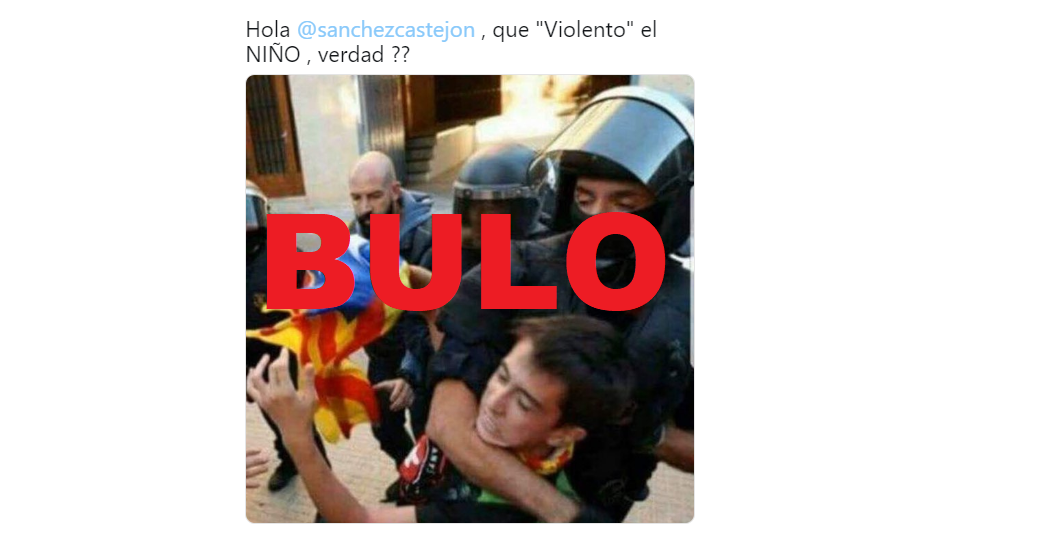Nos estáis preguntando por una foto en la que se ve a un agente agarrando por el cuello a un joven que lleva una esteleda. La foto se mueve como actual y con un mensaje de crítica al presidente del Gobierno: "Hola @sanchezcastejon , que "Violento" el NIÑO , verdad ??". La foto es real, pero no actual.