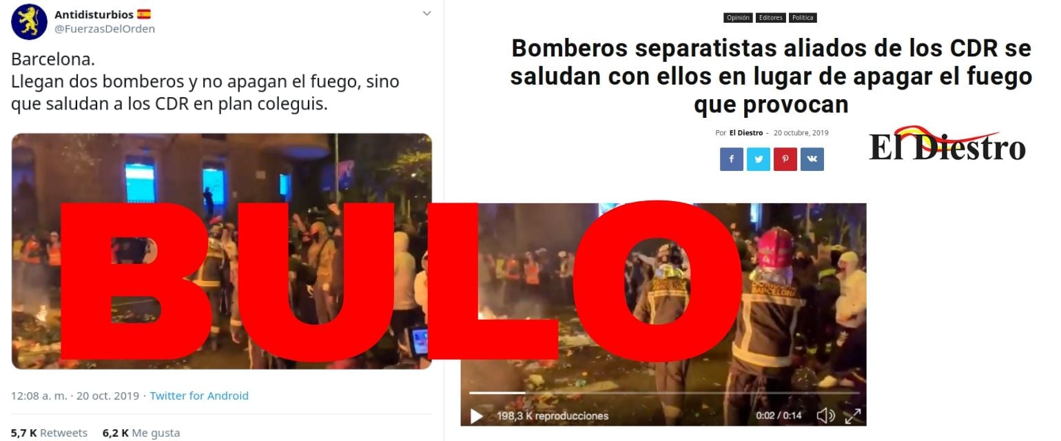 Circula un vídeo en el que se ve a dos bomberos de Barcelona acercarse a un grupo de personas delante de una barricada en llamas del que se dice que se trata de "bomberos separatistas aliados de los CDR [Comités de Defensa de la República]", y que saludan a estos CDR "en lugar de apagar el fuego que provocan". Es un bulo. Los bomberos sí hablan con las personas que han encendido el fuego pero minutos después apagan las llamas, como muestra el vídeo emitido por betevé. Bomberos de Barcelona confirma que fue apagado y afirma que los bomberos pidieron calma. Además, aclaran que siempre se inspecciona un incendio antes de extinguirlo.