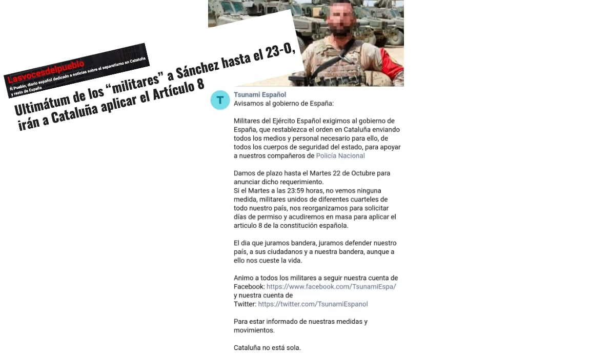 No paráis de preguntarnos a través de nuestro servicio de WhatsApp (655 198 538) por una cuenta de Twitter y Facebook llamada 'Tsunami Español' que supuestamente estaría gestionada por militares que aseguran que se desplazarán a Cataluña si el Gobierno no restablece "el orden en Cataluña enviando todos los medios y personal necesario" antes de este martes, 22 de octubre, a las 23:59. Se sté viralizando en redes y algunas webs lo han vinculado directamente al Ejército; no hay pruebas ni de que el Ejército esté vinculado a 'Tsunami Español' ni de que los que crearon este grupo sean militares.
