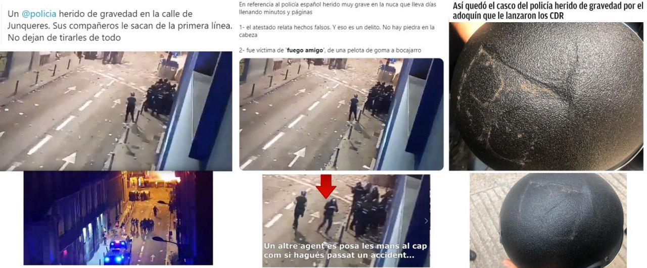 - Tampoco sabemos si el casco fue perforado o roto, ni si la fotografía de un casco abollado que está circulando es del policía herido.