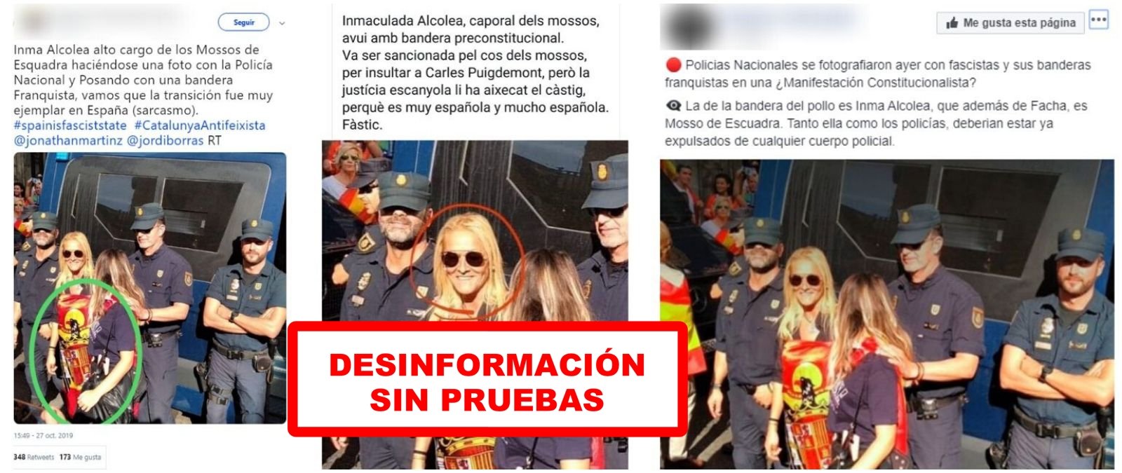Circula una imagen de una mujer con una bandera de España con el Águila de San Juan fotografiándose junto a varios policías nacionales. Aunque la foto es real y se tomó en Barcelona el 27 de octubre de 2019, no hay pruebas de que la mujer con la bandera sea la mossa d'esquadra Inmaculada Alcolea, como se ha publicado en redes sociales.*