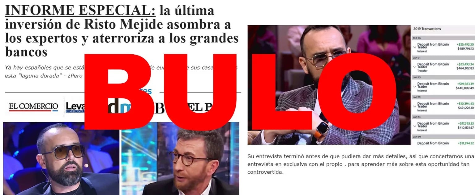Esa vez han usado al presentador de televisión Risto Mejide, quien según el timo habló del dinero que había ganado a través de 'Bitcoin Era', pero eso no ha ocurrido: Risto Mejide no ha hablado en El Hormiguero de 'Bitcoin Era' ni hay pruebas de que haya invertido allí.