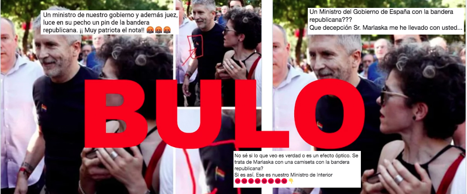 En la imagen que se está difundiendo se ve al ministro de Interior, Fernando Grande-Marlaska, con un pin en la camiseta. Esta fotografía se difunde ahora con el texto: "Un ministro de nuestro gobierno y además juez, luce en su pecho un pin de la bandera republicana. ¡¡Muy patriota el nota!!". Sin embargo, no se trata de la bandera republicana, sino de la bandera LGTB.