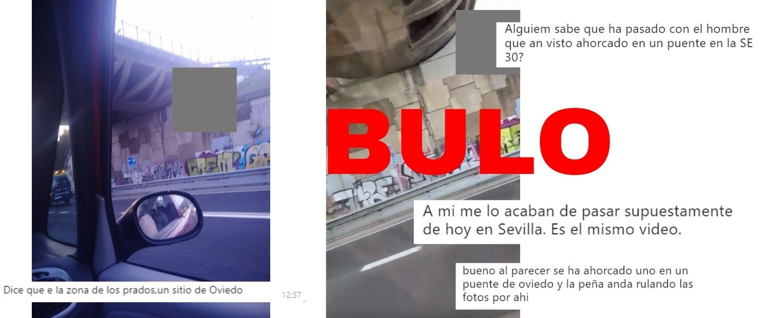 Circula un vídeo de 5 segundos grabado desde un coche en marcha en el que se ve a un hombre colgado desde un puente. Se dice que se trata de Oviedo, Sevilla u otros lugares. En realidad se trata de Bilbao (Vizcaya), tal y como ha confirmado Ertzaintza a Maldita.es.