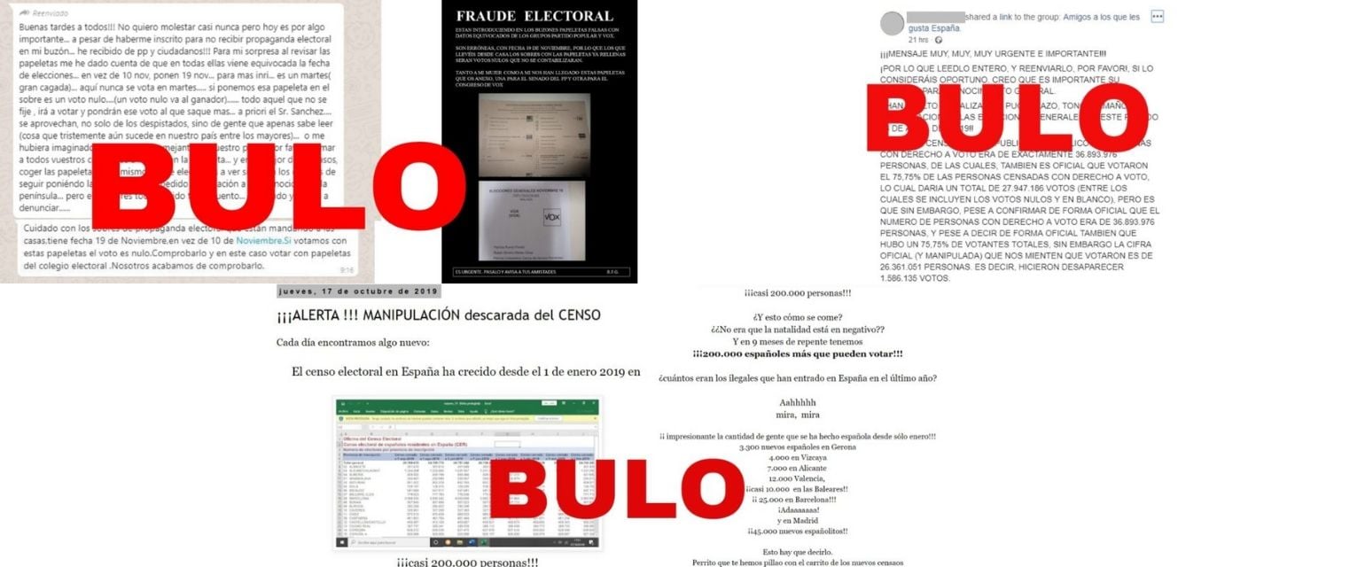 Nos volvéis a preguntar sobre supuestos pucherazo o de fraude electoral en las elecciones generales del 10 de noviembre. Como ya hicimos tras las elecciones del 28 de abril de 2019, os recopilamos los bulos y las desinformaciones sobre supuestos fraudes que hemos desmentidos e iremos ampliando.