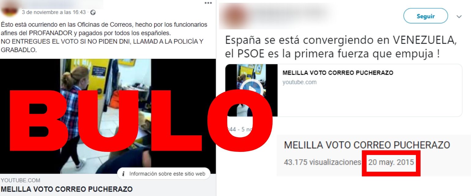 Este vídeo de un supuesto pucherazo no es de las elecciones generales de noviembre de 2019. Está circulando por Internet y es real pero no actual. Es un altercado relacionado con el voto por correo fechado como actual. Pues bien, ni el vídeo es de las elecciones de este 10 de noviembre ni tiene que ver con la izquierda ni con el PSOE. Es de 2015 y está relacionado con el Partido Popular de Melilla. Es un intento de denunciar un falso pucherazo.
