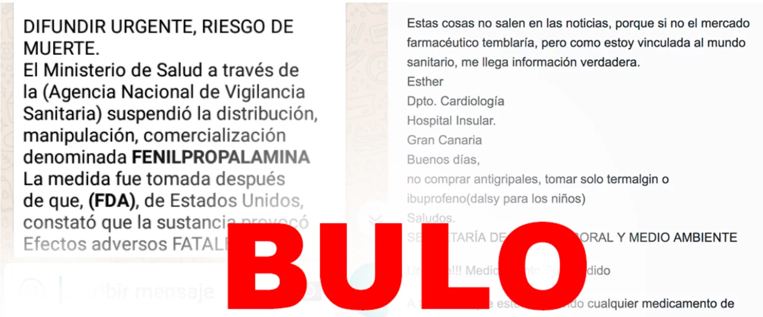 Esta cadena, que afirmaba que había riesgo de muerte por la ingesta de medicamentos con fenilpropanolamina, tiene su origen en una nota informativa que publicó el Ministerio de Salud de Brasil en el año 2000. Entonces, estos medicamentos fueron retirados del mercado. Sin embargo, actualmente no hay ninguna alerta de esas características.
