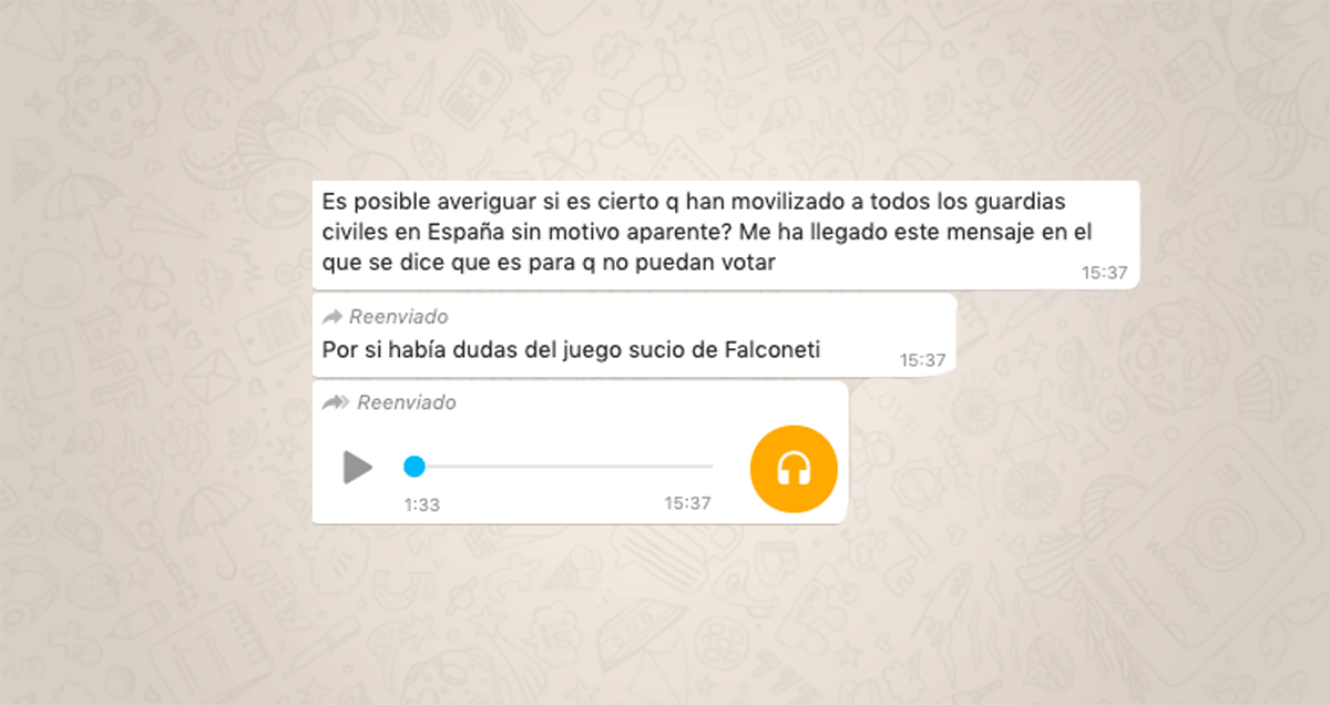 Nos estáis preguntando muchísimo por un audio que denuncia que "a todos los que están en el Escuadrón de Caballería de la Guardia Civil los han mandado a Sevilla para que no puedan votar el domingo", al igual que a todos los agentes de los Grupos de Reserva y Seguridad (GRS) de la Guardia Civil "de toda España". Según la mujer que habla en el audio, todos esos votos "los pierde Vox".