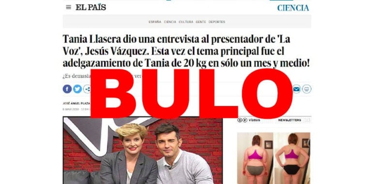 En el contenido se inventan una entrevista de Tania Llasera con Jesús Vázquez en el programa La Voz, donde supuestamente recomendó las pastillas milagrosas para perder peso, pero no hay rastro de la entrevista.