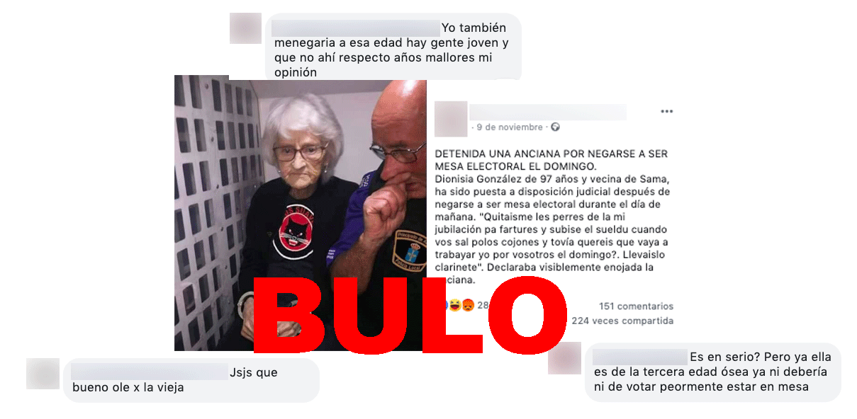En definitiva, no es cierto que sea una mujer de 97 años detenida "por negarse a ser mesa electoral".