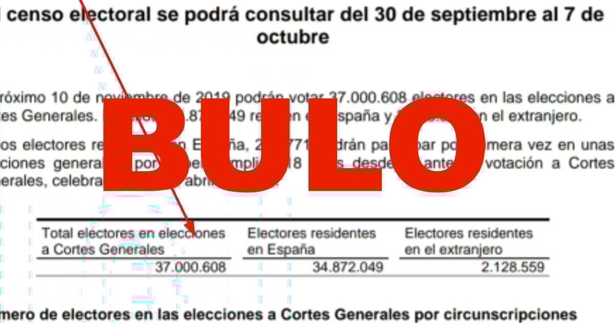 Además, el dato de los electores utilizado en el vídeo es incorrecto: la propia nota de prensa del INE, del 27 de septiembre, que da la cifra de los 37.000.068 millones españoles con derecho a voto resalta que se abría un plazo para presentar reclamaciones a los datos de inscripción. Los datos definitivos de electores puede consultarse en la web del INE, bajo el epígrafe "censo de consulta más reclamaciones", y suman 37.001.219.