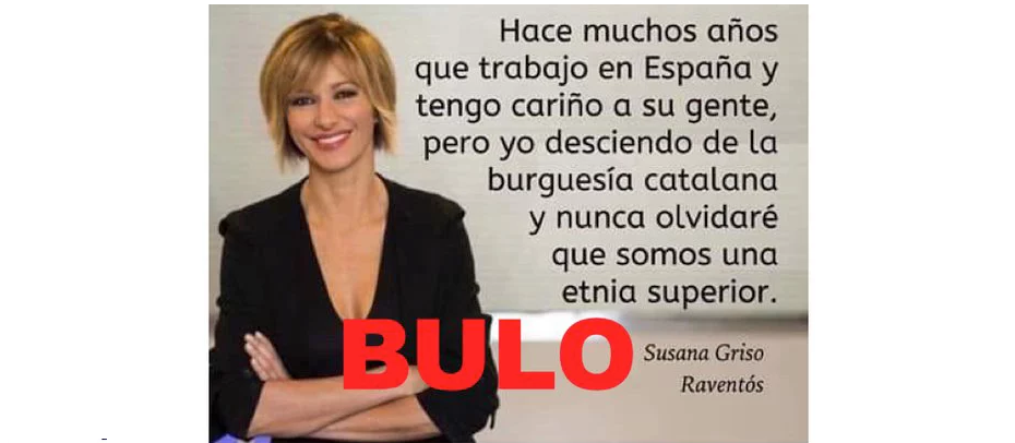No, no existe ninguna prueba de que Susanna Griso haya dicho que los catalanes "somos una etnia superior". Se mueve un meme con una foto de la presentadora de Antena 3 y el siguiente texto: " hace muchos años que trabajo en España y tengo cariño a su gente, pero yo desciendo de la burguesía catalana y nunca olvidaré que somos una etnia superior". Es un bulo.