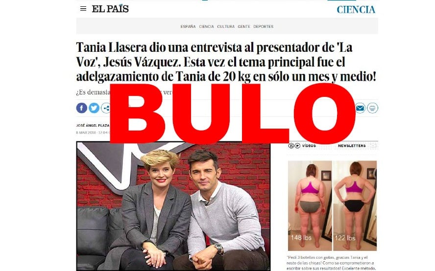 En el contenido se inventan una entrevista de Tania Llasera con Jesús Vázquez en el programa La Voz, donde supuestamente recomendó las pastillas milagrosas para perder peso, pero no hay rastro de la entrevista.