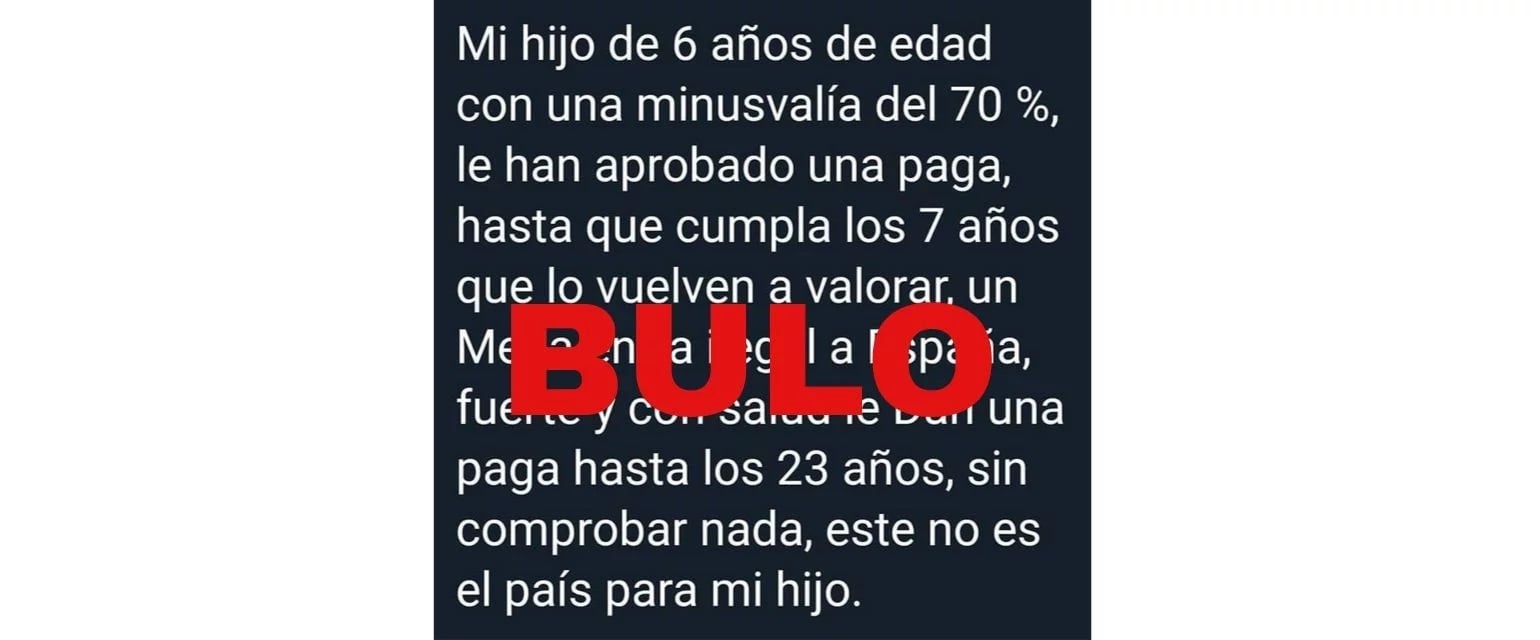 Con respecto a la parte del mensaje que dice " mi hijo de 6 años de edad con una minusvalía del 70% le han aprobado una paga, hasta que cumpla los 7 años que lo vuelven a valorar", desde Maldita.es no entramos a valorar la cuantía o las condiciones en las que se otorgan dichas ayudas.