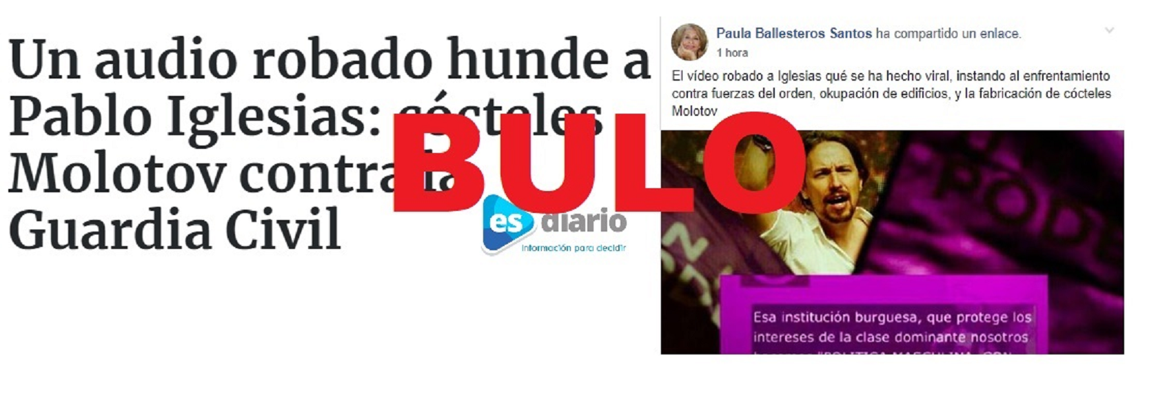 "Un audio robado hunde a Pablo Iglesias: cócteles Molotov contra la Guardia Civil". Esta desinformación sobre Iglesias se mueve con este titular impactante. Esdiario lo publicó como si fuera un "audio robado" y lo difundió como real. Hasta políticos del Partido Popular lo han utilizado. La realidad es que, además descontextualizado, no aparece completo. Es en realidad un discurso paródico, lo reconoce varias veces el propio Iglesias que llega a decir que: “cualquiera que se identificase con la caricatura que he representado no sólo sería un psicópata, sería un subnormal profundo”. Este bulo se vuelve a viralizar con el preacuerdo PSOE-Podemos. Os lo explicamos:
