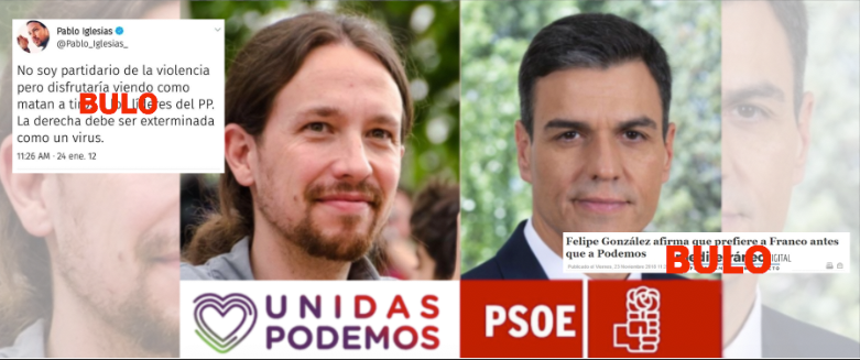 Tras el preacuerdo de Gobierno firmado entre PSOE y Unidas Podemos el 11 de noviembre están circulando varios bulos sobre ambos partidos y sobre sus líderes. Te los contamos: