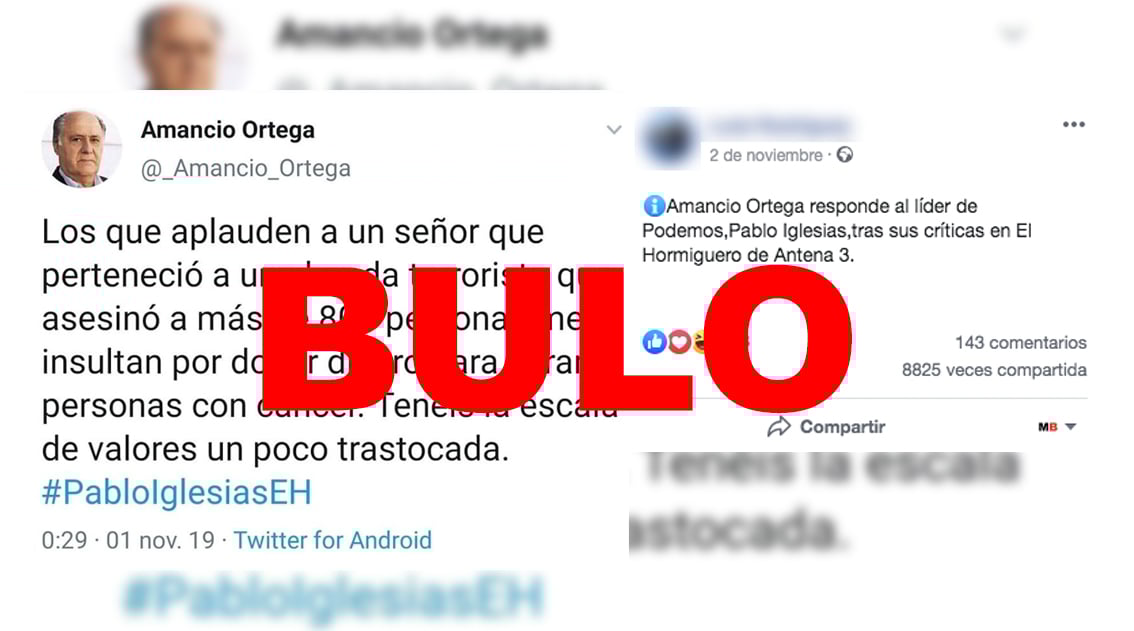 El tuit se publicó en la cuenta parodia el 1 de noviembre y tiene más de 12.000 compartidos. En Facebook, se difunde también el tuit (con una captura de pantalla) con comentarios como "Amancio Ortega responde al líder de Podemos, Pablo Iglesias, tras sus críticas en El Hormiguero de Antena 3", una publicación que tiene más de 8.000 compartidos. Esto hace referencia a que en el tuit viral se incluye la etiqueta "#PabloIglesiasEH", que es la que utilizaron los usuarios de Twitter para comentar la entrevista a Iglesias en El Hormiguero del pasado 31 de octubre. La publicación de la que os hablamos es la siguiente: