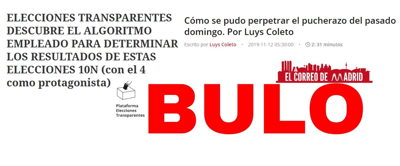 Tras las últimas elecciones generales, vuelven a circular bulos que afirman que hubo pucherazo o fraude electoral. Al igual que tras las elecciones de abril, uno de esos bulos que afirma que un algoritmo con múltiplos de cuatro muestra que los resultados de las elecciones estaban determinados de antemano. Es un bulo. En abril se dijo que era un algoritmo con múltiplos de tres. También era un bulo.