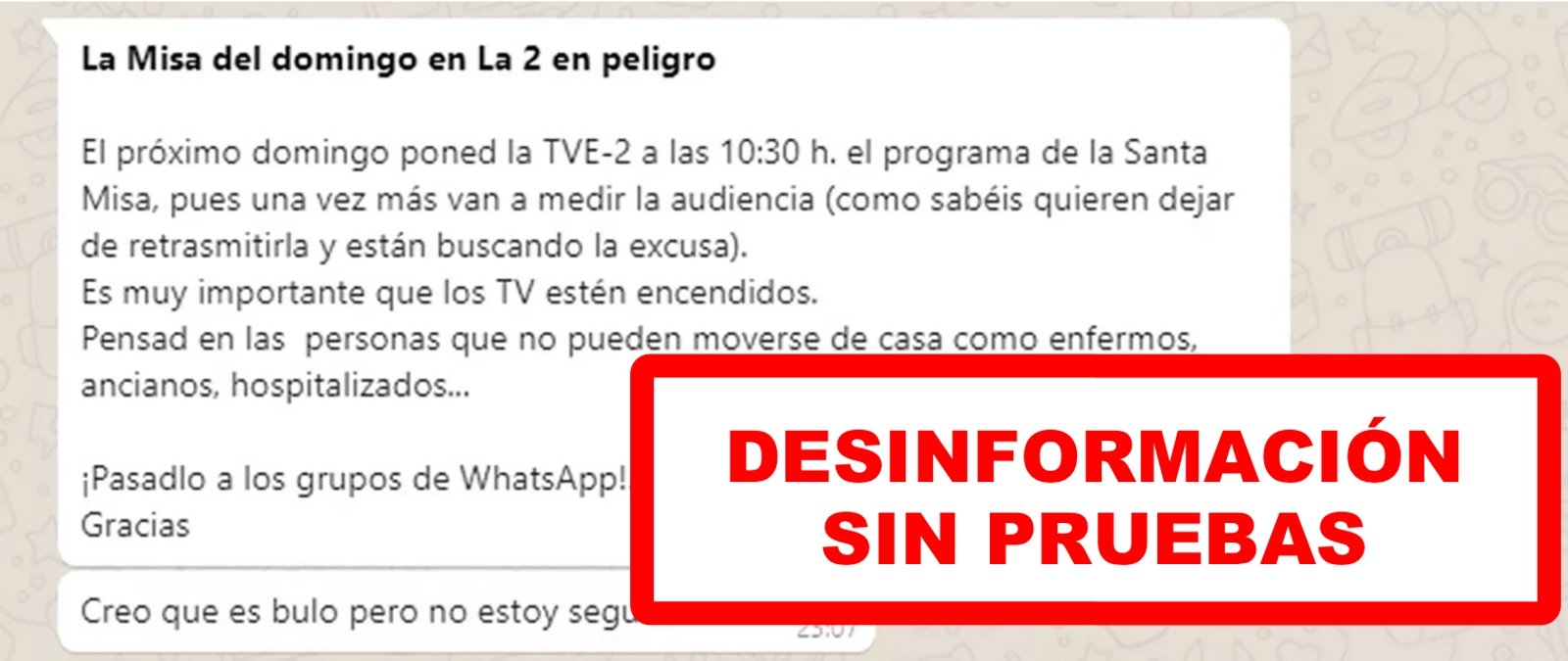 Cada cierto tiempo regresa una cadena de WhatsApp que afirma que "La Misa del domingo en La 2 en peligro" y llama a poner esa cadena "el próximo domingo" porque "van a medir la audiencia". Según la cadena de WhatsApp, quieren dejar de transmitirla "y están buscando la excusa".*