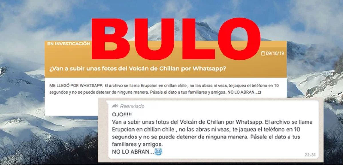 Nos habéis preguntado a través de 'La Buloteca' por una cadena de WhatsApp que afirma que si recibes un archivo que se llama "erupción en Chillán Chile" no debes abrirlo porque lleva un virus que te hackea el móvil. Es un bulo. El mensaje es el siguiente:
