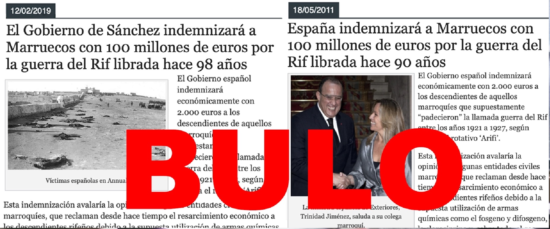 de una supuesta indemnización de 100 millones de euros del Gobierno de España a los descendientes de la Guerra del Rif. Esa afirmación se basa en un contenido de la web Alerta Digital publicado en febrero, que ya había publicado en 2011 con el mismo texto y las mismas cifras, pero cambiando los nombres de los protagonistas.