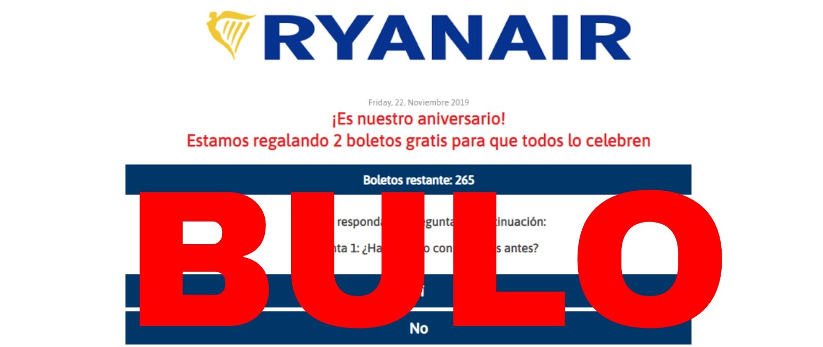 Nos habéis consultado a través de nuestro servicio de WhatsApp (655 19 85 38) por una web que bajo el logo de Rynair dice "Estamos regalando 2 boletos gratis para que todos lo celebren". Es un bulo: no es una oferta real ni es la web oficial de la aerolínea. Se trata de 'phishing', una técnica para hacerse con tus datos.