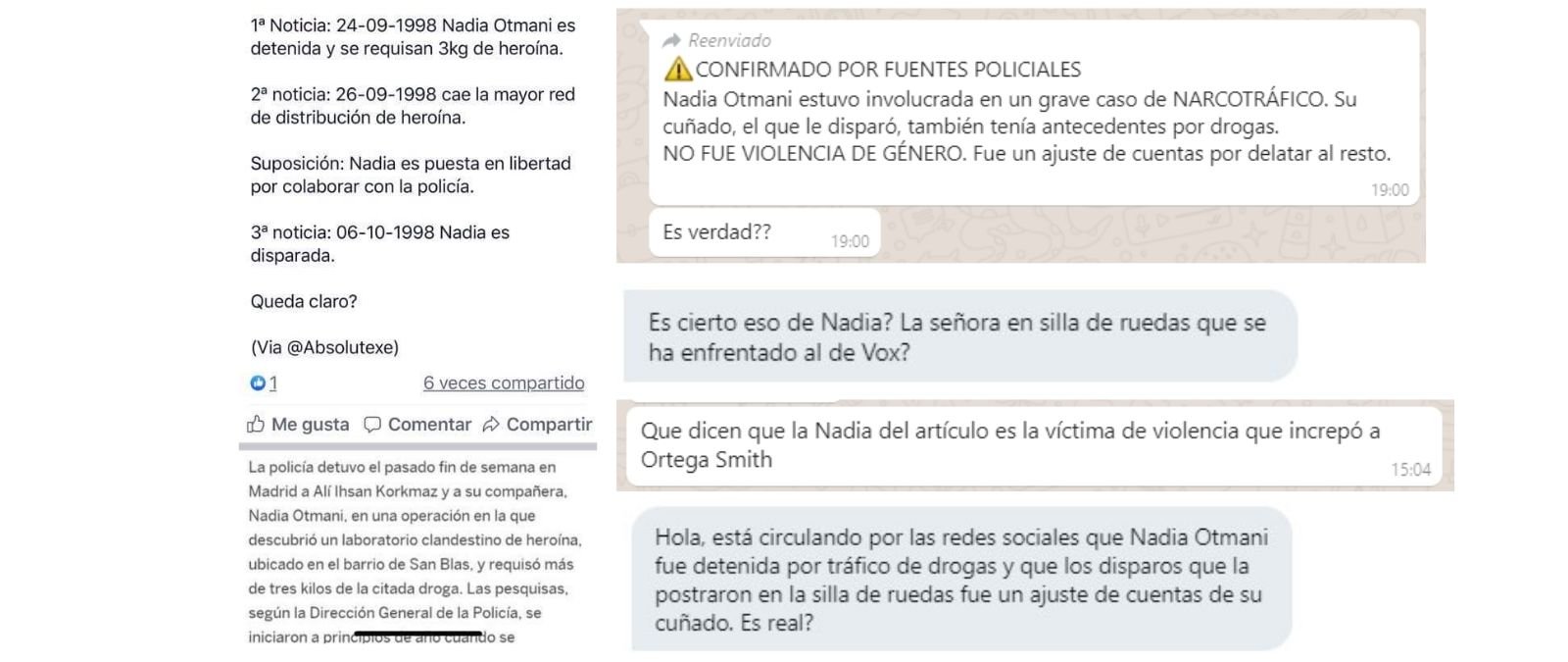 El 25 de noviembre Nadia Otmani, de la asociación de mujeres marroquíes Al Amal, increpó al secretario general de VOX, Javier Ortega Smith-Molina, durante un acto contra la violencia de género en Madrid. Tras ello se han difundido imágenes de artículos de prensa de 1998 que hablan de la detención de una mujer llamada Nadia Otmani en una operación por narcotráfico. En redes sociales circulan mensajes que sugieren que se trata de la misma persona y que el intento de asesinato que sufrió por parte de su cuñado fue un ajuste de cuentas.