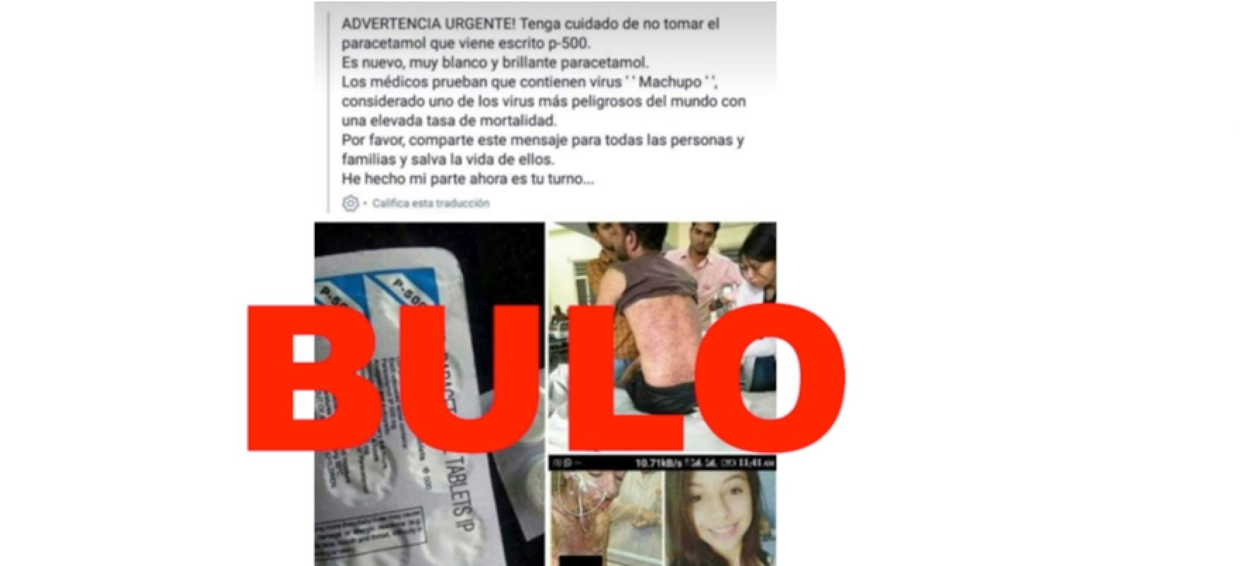 Nos estáis preguntando por una cadena a través de nuestro servicio de WhatsApp (655 198 538) que advierte sobre el supuesto peligro que supone tomar "el paracetamol en el que aparece escrito p-500" ya que contendría un supuesto "virus Machupo", "considerado uno de los más peligrosos del mundo, con una elevada tasa de mortalidad".
