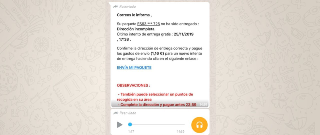 La imagen circula junto a un audio que alerta de que se trata de una estafa. En el audio, una mujer que dice trabajar "en la oficina de Correos de Fuenlabrada" dice que piden pagar con tarjeta y que cuando facilitas el número "te sacan el dinero". Asegura también que a una persona "le sacaron 700 euros de la cuenta".