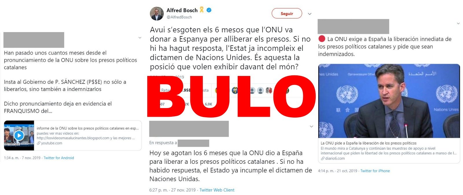 Están circulando mensajes en Twitter que afirman que España “ya incumple el dictamen de Naciones Unidas" y que "la ONU dio a España" seis meses "para liberar a los presos". Es un bulo. El Grupo de Trabajo de Detenciones Arbitrarias de la ONU emitió hace seis meses una opinión que considera arbitraria la encarcelación de Jordi Cuixart, Jordi Sánchez y Oriol Junqueras y recomienda su liberación inmediata, pero no es una declaración oficial de la ONU.