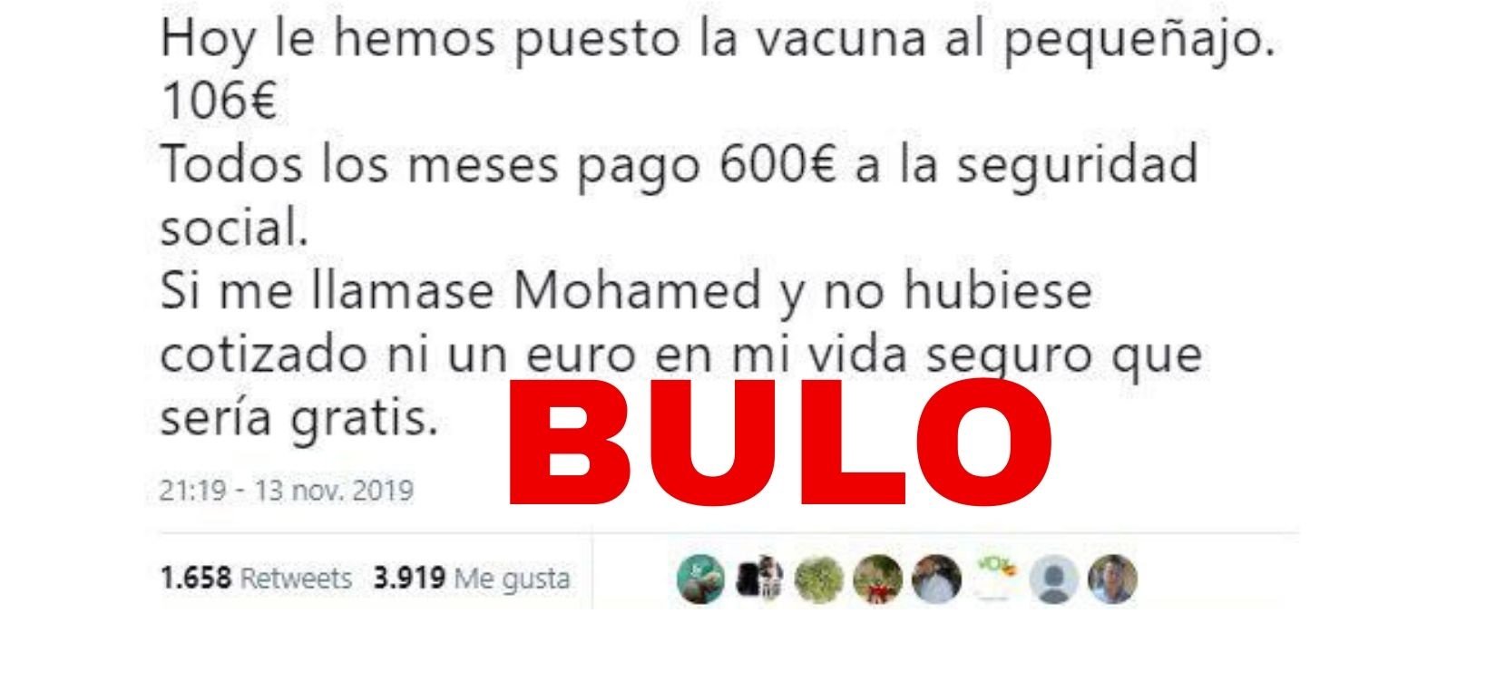 Nos habéis preguntado por un mensaje en Twitter en el que supuestamente un padre asegura que "hoy le hemos puesto la vacuna al pequeñajo. 106€. Todos los meses pago 600€ a la seguridad social. Si me llamase Mohamed y no hubiese cotizado ni un euro en mi vida seguro que sería gratis". Es un bulo.
