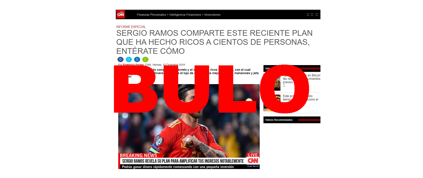 El futbolista del Real Madrid y de la selección española, Sergio Ramos, ha sido uno de los últimos protagonistas del timo de las falsas inversiones en bitcoin que usa caras conocidas para intentar timarte. En este caso, se mueve como si Ramos hubiera recomendado invertir en Bitcoin Trader en un artículo de la CNN. No es cierto: ni ha hecho esa recomendación ni es un artículo real de la cadena norteamericana.