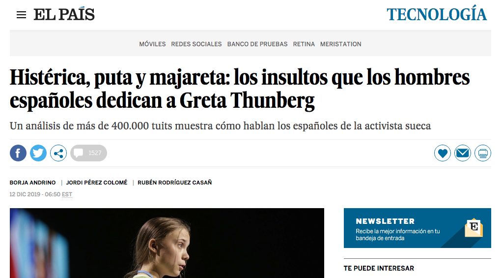 El 12 de noviembre el diario El País publicó un artículo analizando decenas de miles de tuits para mostrar cómo "los hombres españoles" hablan de la activista climática Greta Thunberg bajo varios titulares (siendo uno de ellos "Histérica, puta y majareta: los insultos que los hombres españoles dedican a Greta Thunberg en Twitter") que ha causado polémica en Twitter por dudas sobre su metodología. Esto es lo que sabemos del tema: