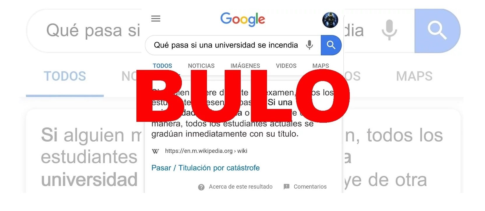 ¿Qué pasa si mi universidad se incendia? En los últimos días se ha hecho viral una imagen de una supuesta publicación de Wikipedia sobre las consecuencias de un incendio en una universidad. En esta se afirma que "si una universidad se incendia", "todos los estudiantes actuales se gradúan inmediatamente con su título".