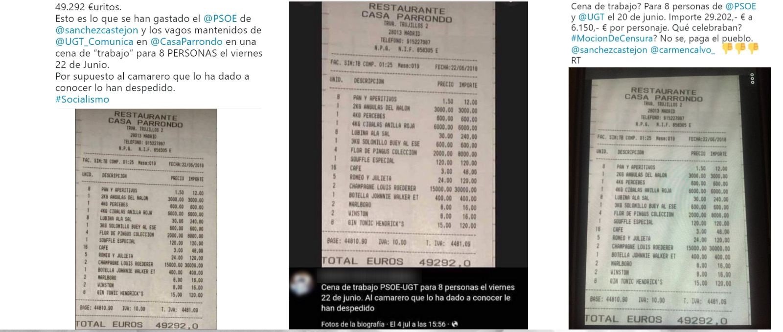 Desde hace meses circula el ticket de una cena por 49.292 euros en el restaurante Casa Parrondo de Madrid que incluye kilos de mariscos y dos botellas de champán de 15.000 euros cada una. El ticket tiene fecha de 22 de junio de 2018 y se suele atribuir en redes sociales a una cena de trabajo de 8 personas del sindicato UGT (Unión General del Trabajo) y del PSOE (Partido Socialista Obrero Español). Esto es lo que sabemos.