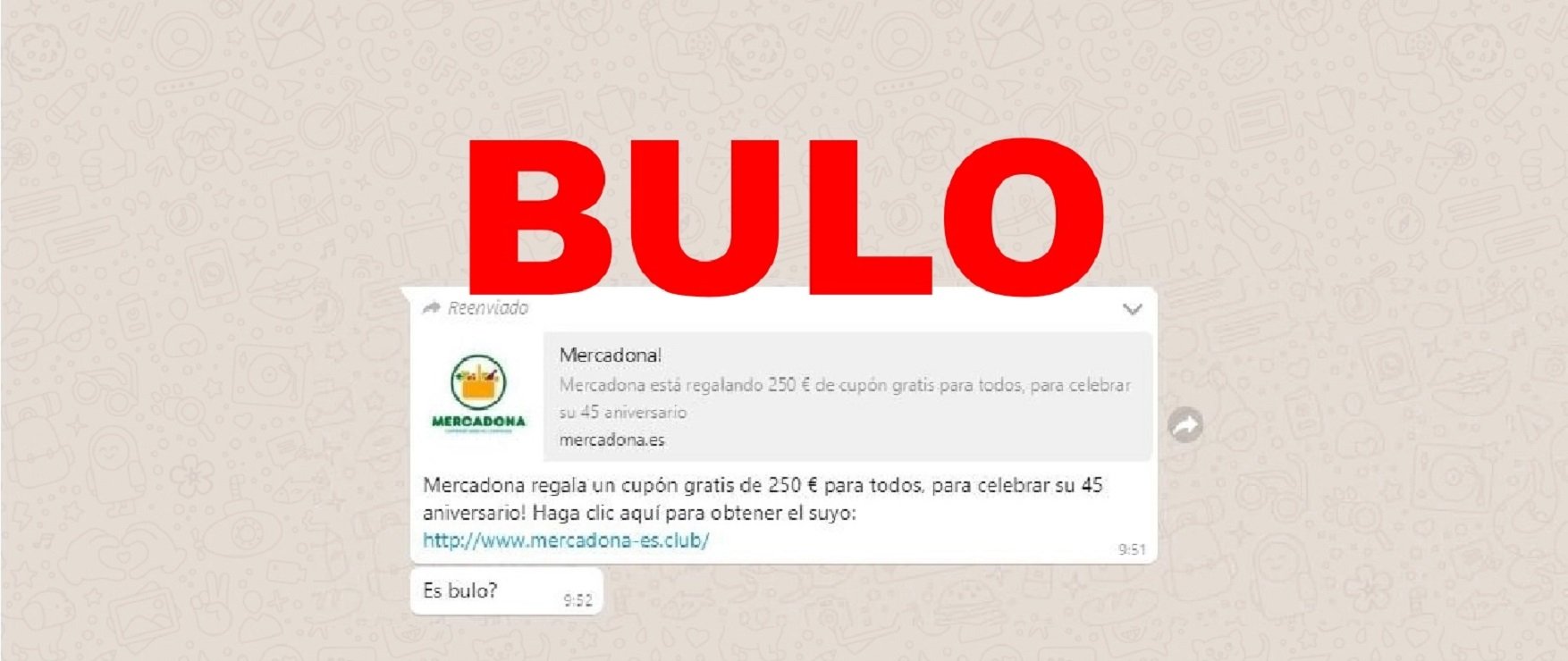Nos habéis preguntado a través de nuestro servicio de WhatsApp por un mensaje que anuncia que Mercadona "regala un cupón gratis de 250€" con la excusa de la celebración de su "45 aniversario". Es un bulo que nos desmiente la propia compañía. Se trata de phishing, una técnica que busca hacerse con tus datos.
