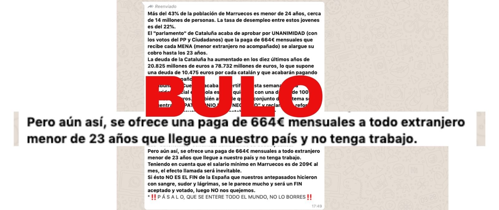 Nos ha llegado una cadena de Whastapp que empieza hablando de la población en Marruecos "más del 43% de la población de Marruecos es menor de 24 años, cerca de 14 millones de personas". Después, pasa por la deuda de Cataluña y cierra con el salario mínimo en Marruecos. A medio camino asegura que "se ofrece una paga de 664€ mensuales a todo extranjero menor de 23 años que llegue a nuestro país y no tenga trabajo".