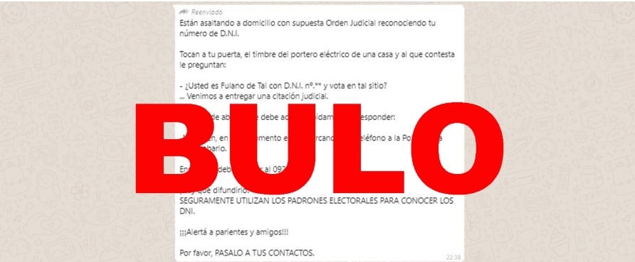 En el mensaje que se ha vuelto viral se afirma que unas personas están llamando a los telefonillos y, para que les abras, te avisan de que van a entregarte una orden judicial. Afirman que te dicen tu número de DNI, tu "cédula de identidad" o tus datos del padrón. Sin embargo, no hay ninguna alerta por estos robos. El Grupo de Delitos Telemáticos de la Guardia Civil ya lo desmintió en su cuenta de Twitter, afirmando que no se tiene conocimiento de que "esto esté sucediendo en nuestro país".