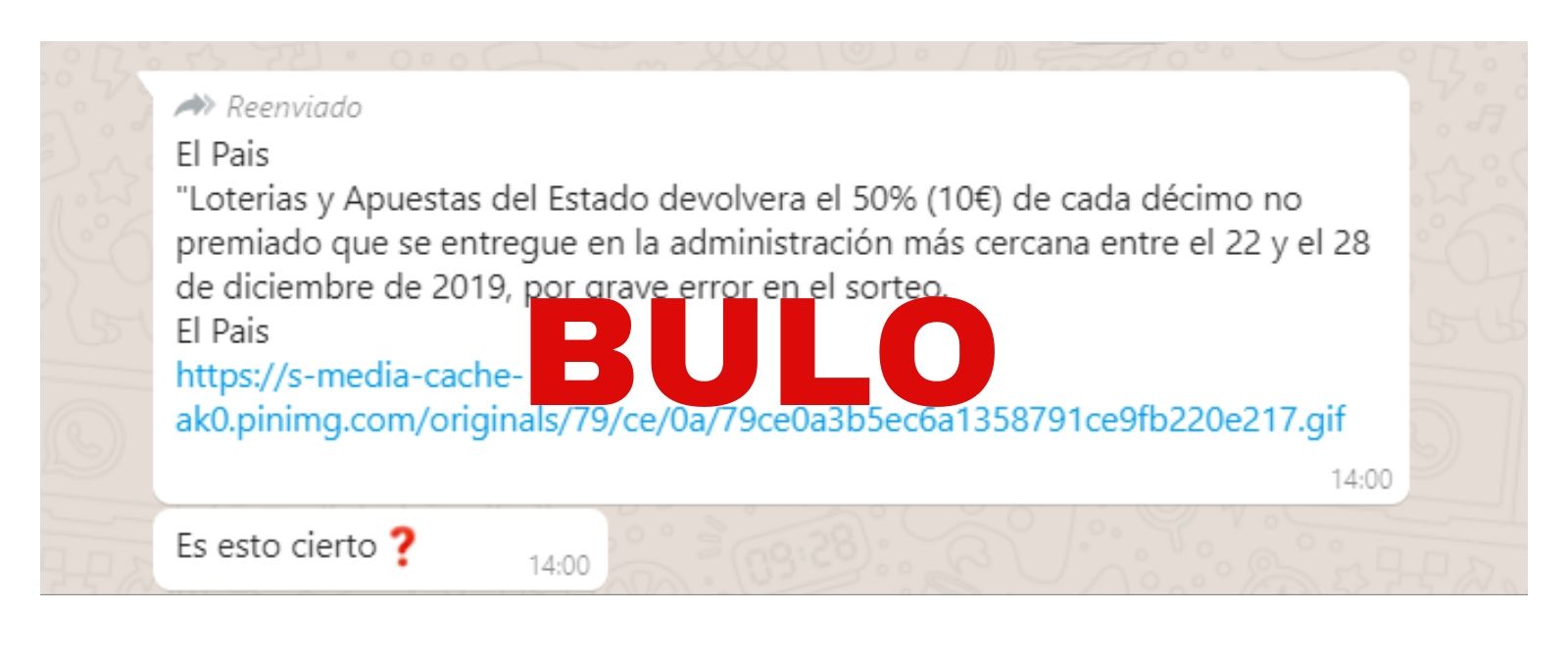Nos habéis preguntado por un mensaje que se está difundiendo en redes que dice así: "Loterías y Apuestas del Estado devolverá el 50% (10€) de cada décimo no premiado que se entregue en la administración más cercana entre el 22 y el 28 de diciembre de 2019, por grave error en el sorteo".