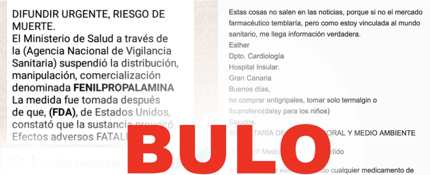 Esta cadena, que afirmaba que había riesgo de muerte por la ingesta de medicamentos con fenilpropanolamina, tiene su origen en una nota informativa que publicó el Ministerio de Salud de Brasil en el año 2000. Entonces, estos medicamentos fueron retirados del mercado. Sin embargo, actualmente no hay ninguna alerta de esas características.