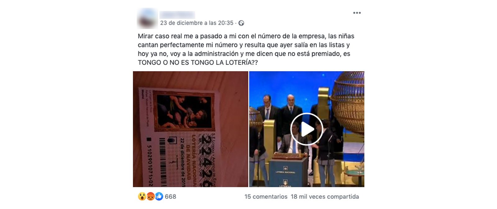 Se ha viralizado en Facebook la publicación de una persona que denuncia que no pudo cobrar el premio de uno de sus décimos, el 22.426, pese a que este número había sido cantado por las niñas de San Ildefonso. En concreto, asegura que cuando fue a cobrarlo a la administración de lotería le dijeron que no había sido premiado. Desde Loterías y Apuestas del Estado nos dicen que ese número se cantó por error y que el premiado fue otro.
