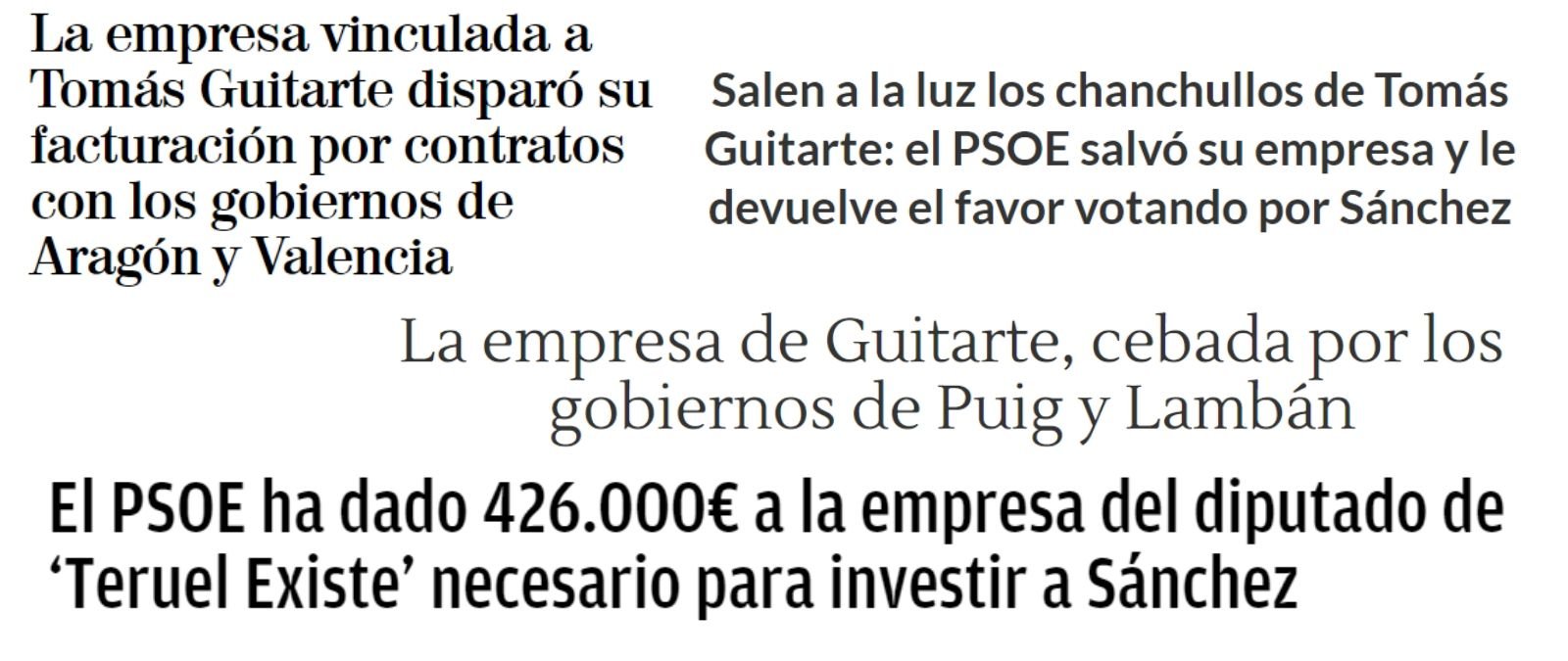 El 6 de enero El Mundo publicaba que 'La empresa de Tomás Guitarte dispara su facturación por contratos con los gobiernos de Aragón y Valencia'. Horas después, cambiaba el titular a 'La empresa vinculada a Tomás Guitarte disparó su facturación por contratos con los gobiernos de Aragón y Valencia'. Es decir, la empresa ha pasado de ser de Tomás Guitarte a sólo "vinculada" y "dispara" por "disparó".