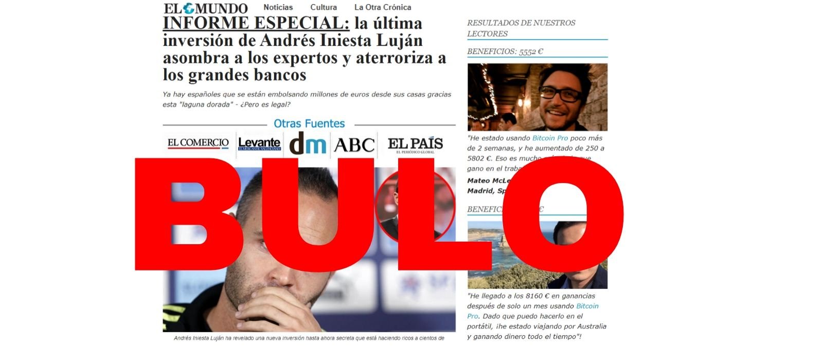 Ya os hemos hablado numerosas veces de este timo que usa caras conocidas como la de Risto Mejide o Dani Rovira. Ahora también se difunde utilizando el nombre de Andrés Iniesta y afirmando que ha ido al programa El Hormiguero a hablar de "cómo gana su dinero" con una "operación automática de criptomoneda llamado Bitcoin Pro". No te lo creas, es un timo que intenta quedarse con tu dinero.