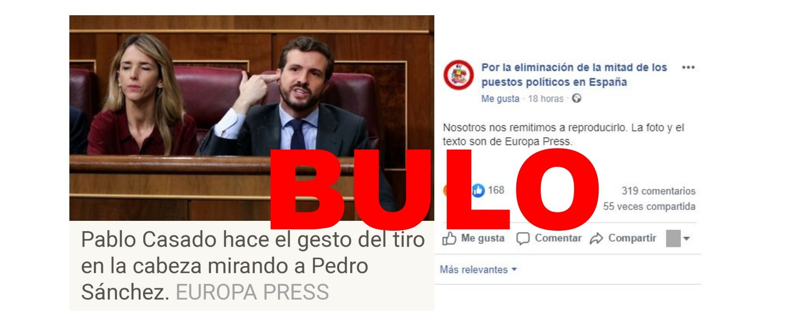 Se está difundiendo en Facebook una fotografía del debate de investidura en la que se ve gesticular al líder del Partido Popular, Pablo Casado, y cuyo pie de foto afirma: "Pablo Casado hace el gesto del tiro en la cabeza mirando a Pedro Sánchez. EUROPA PRESS". En el comentario de la publicación se asegura que "la foto y el texto son de Europa Press". Pero Pablo Casado no hace "el gesto del tiro en la cabeza" al líder socialista y no hay pruebas de que Europa Press publicara este pie de foto. Sin embargo, dicho pie de foto sí que fue publicado –y luego cambiado– por eldiario.es.