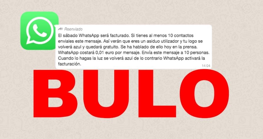 Nos estáis volviendo a consultar por una cadena que afirma que "el sábado WhatsApp será facturado" y que puedes evitar que te cobre si reenvías el mensaje a 10 personas. Es un bulo que circula desde hace años.