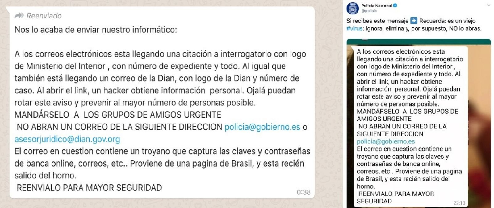 "Nos lo acaba de enviar nuestro informático:A los correos electrónicos esta llegando una citación a interrogatorio con logo de Ministerio del Interior , con número de expediente y todo. Al igual que también está llegando un correo de la Dian, con logo de la Dian y número de caso. Al abrir el link, un hacker obtiene información personal. Ojalá puedan rotar este aviso y prevenir al mayor número de personas posible.MANDÁRSELO A LOS GRUPOS DE AMIGOS URGENTE NO ABRAN UN CORREO DE LA SIGUIENTE DIRECCION [email protected] o [email protected]. El correo en cuestion contiene un troyano que captura las claves y contraseñas de banca online, correos, etc.. Proviene de una pagina de Brasil, y esta recién salido del horno. REENVIALO PARA MAYOR SEGURIDAD"
