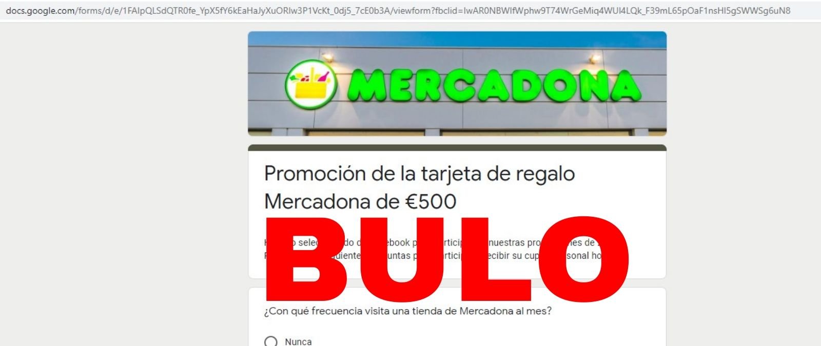 Os ha llegado un enlace de Google Docs que dice que Facebook te ha seleccionado para "participar en nuestras promociones de 2019" de tarjeta de regalo Mercadona de 500 euros. Se trata de 'phishing', una técnica que busca hacerse con tus datos.