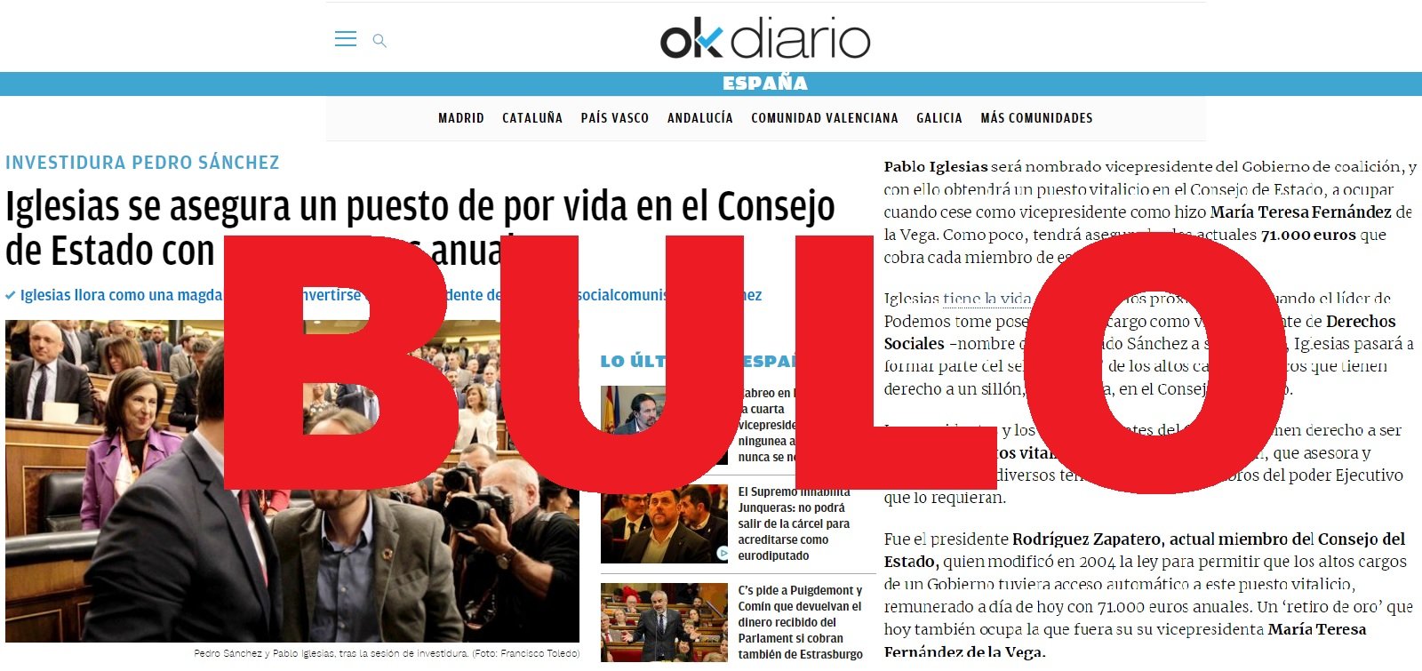 OKDiario publicó el 7 de enero de 2020 que Pablo Iglesias se asegurará "un puesto de por vida en el Consejo de Estado" cuando sea nombrado vicepresidente del gobierno. Es un bulo y OkDiario modificó su versión tras la publicación de este artículo. *