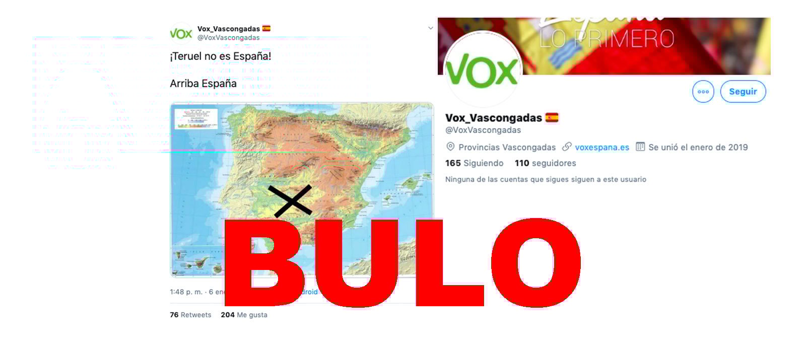 Nos han llegado varias consultas a través de nuestro servicio de WhatsApp (655 198 538) preguntando por la cuenta de Twitter @ Vox_Vascongadas, que este 6 de enero tuiteó que "Teruel no es España" y ubicó dicha ciudad en un mapa de España de forma incorrecta, coincidiendo con el apoyo de Teruel Existe a la investidura de Pedro Sánchez. No es una cuenta oficial de Vox.