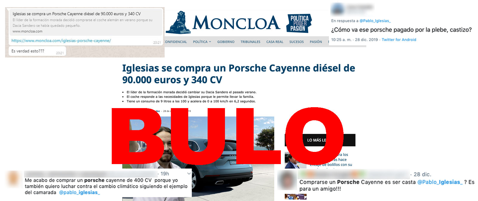 Pablo Iglesias no se ha comprado "un Porsche Cayenne de 90.000 euros. Nos estáis preguntando mucho a través de nuestro servicio de WhatsApp (655 198 538) y de La Buloteca por un contenido de la web Moncloa.com en el que se asegura que el secretario general de Podemos, Pablo Iglesias, se ha comprado "un Porsche Cayenne de 90.000 euros y 340 CV". No es cierto: se trata de un contenido escrito por dicha página con motivo del Día de los Inocentes.
